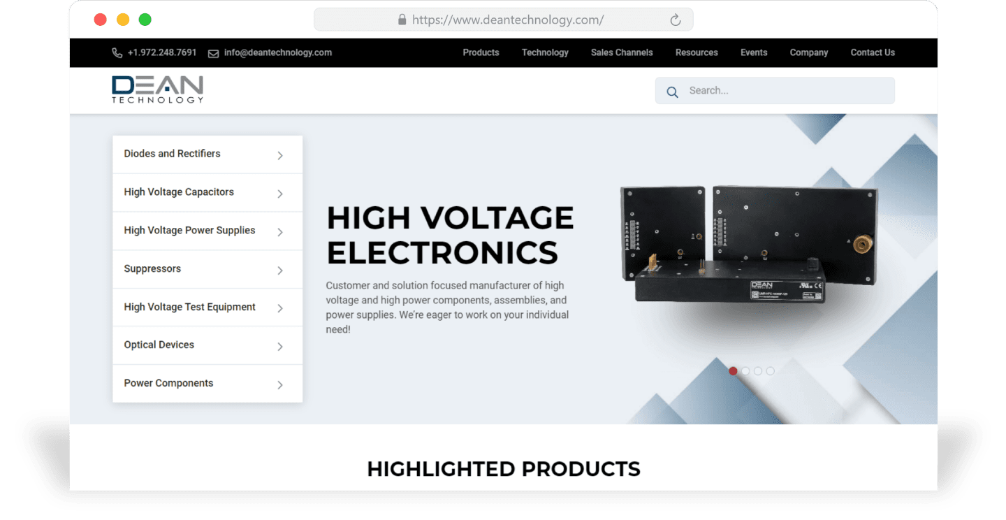 Dean Technology, Inc. has a long and exceptional history of providing world-class products, designs, and solutions for high voltage and high power markets and applications. Grown through the consolidation of many complementary brands, the full product offering can supply everything from components to complete systems. Given the diverse array of offerings, a robust eCommerce platform is crucial for effective advertising and sales. Thrive met and exceeded this requirement by constructing a website that not only facilitates transactions but also educates users.