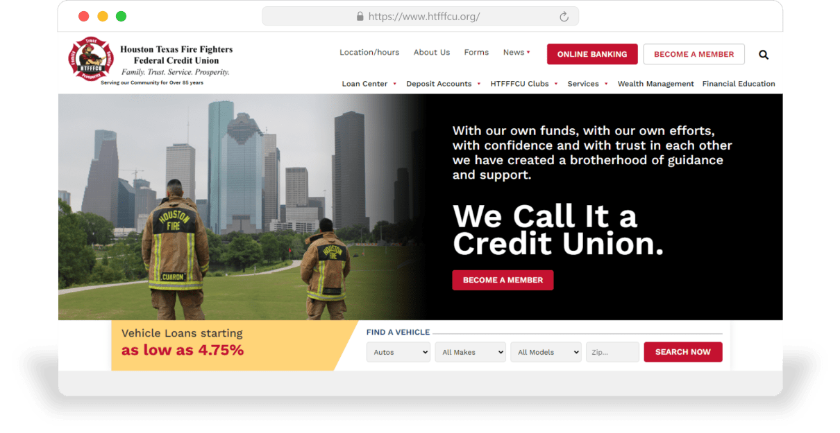 The Houston Texas Fire Fighters Federal Credit Unionโs (HTTFCU) revamped website enabled the company to effectively connect with its nationwide membership base and provide the customized service they expect. The result was a successful fusion of design aesthetics and functionality, establishing the HTTFCU as a technologically advanced financial institution.