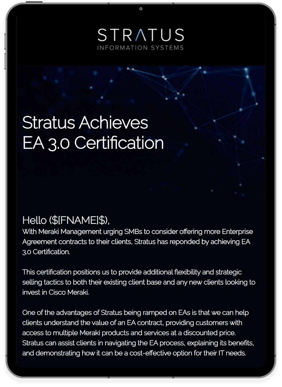 Stratus Info Systems works with Cisco Meraki to create network strategies and implement solutions for businesses across all verticals. They approached Thrive to build and send weekly emails to their Cisco contacts to provide updates on their recent deals and certifications, to ensure that they’re being kept in mind as a referral.