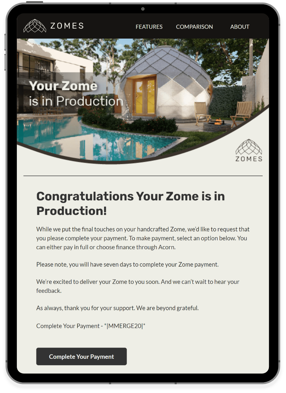 Zomes was in the process of launching its first product to the market, a ready-made dome dwelling that could be delivered and lived in within 7 days after production. They had no email marketing in place, as the company was a start-up, and needed a handful of templated emails built to be sent based on certain triggers in the purchase and production processes.